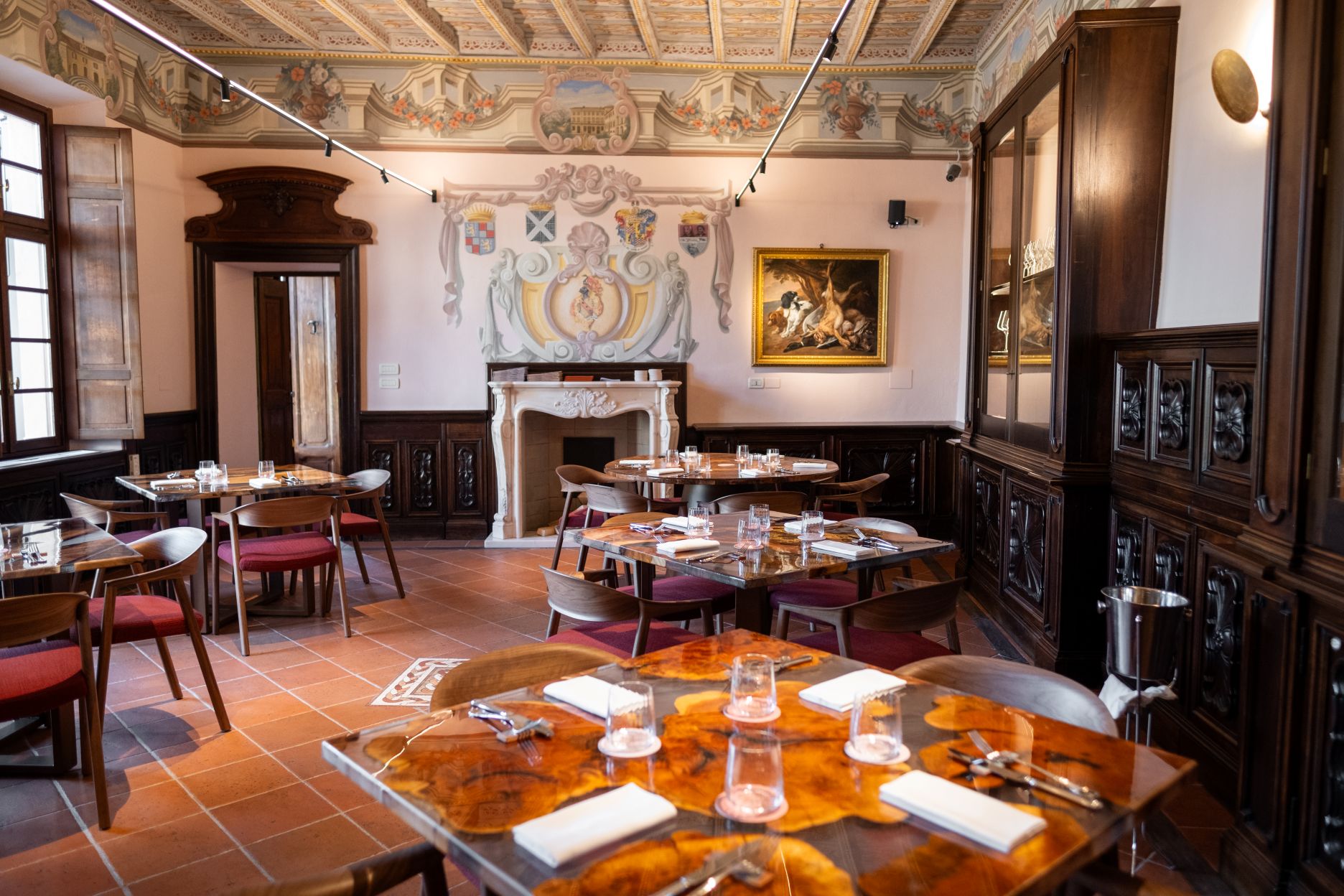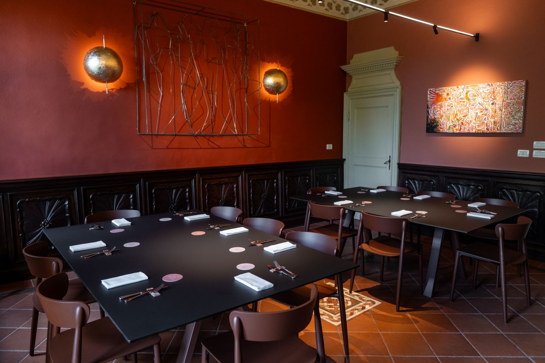 - le sale ristorante, già ricche di ornamenti e dettagli opulenti, in cui l’essenzialità delle linee di tavoli, sedie, e luci di design contemporaneo ci ha permesso di creare uno spazio sofisticato ma accogliente,