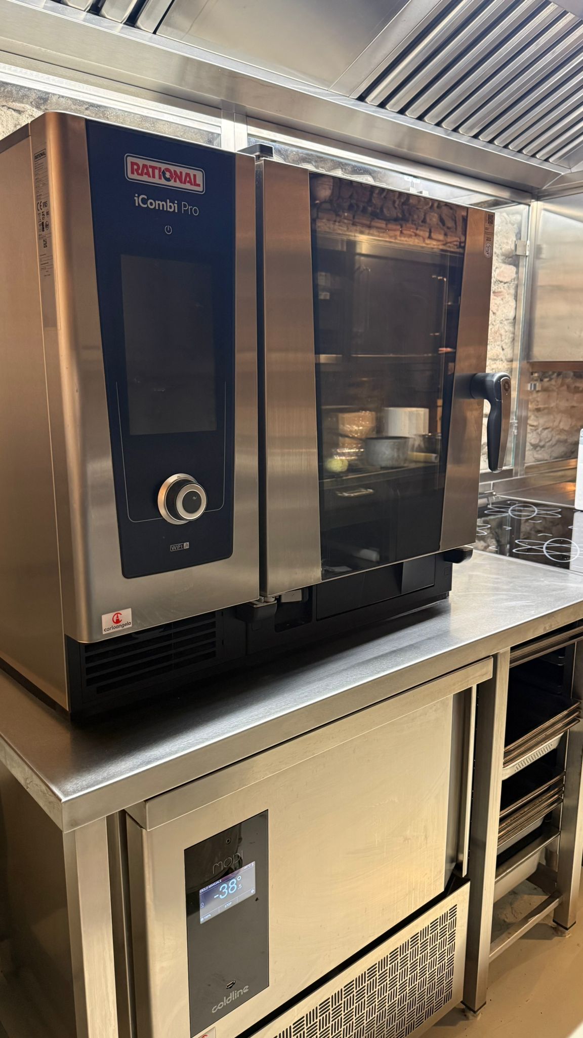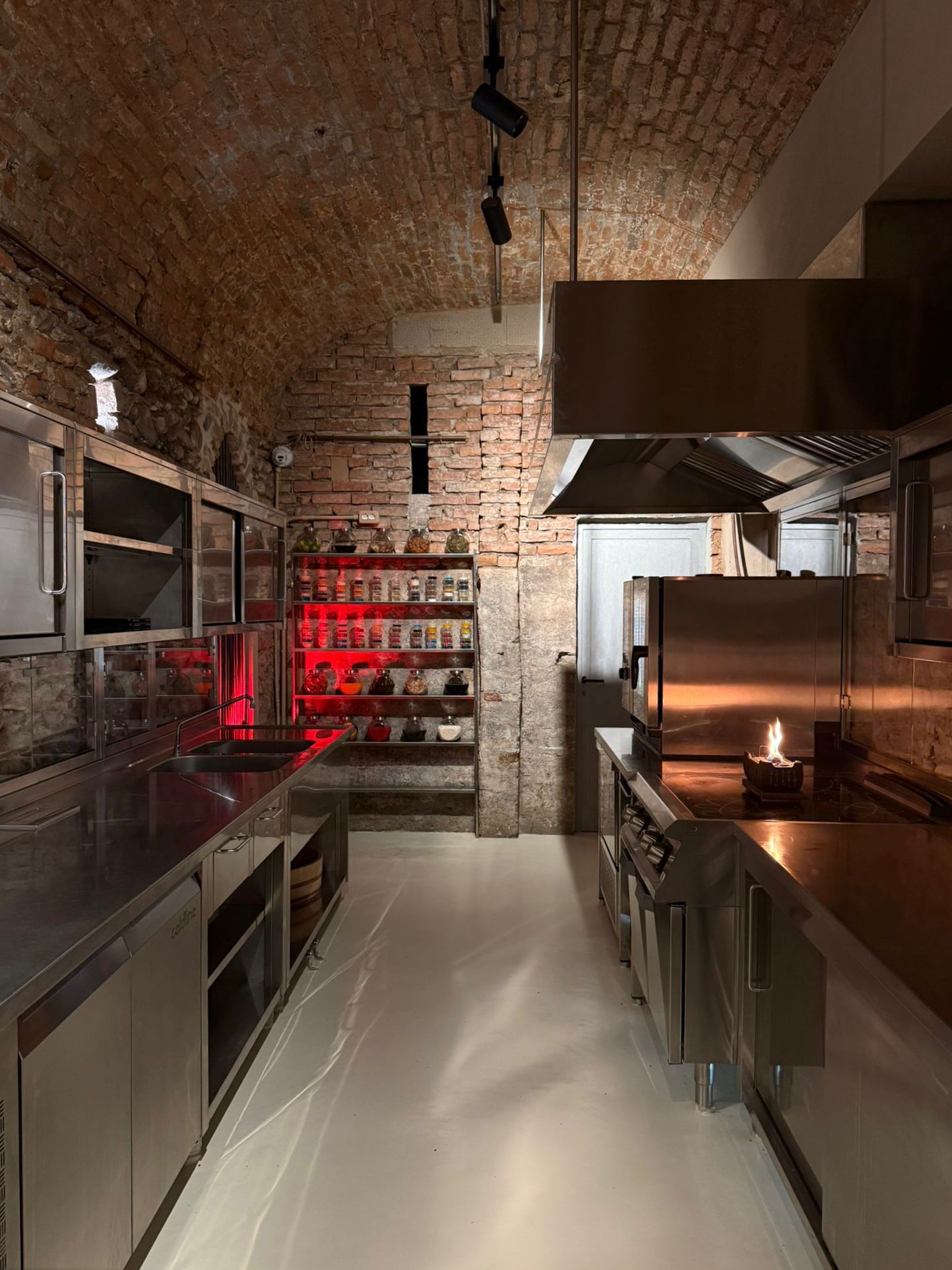 Progettazione cucina in acciaio inox all'interno di una galleria d'arte, utilizzando attrezzature d’avanguardia in un contesto di antiche mura di pietra.